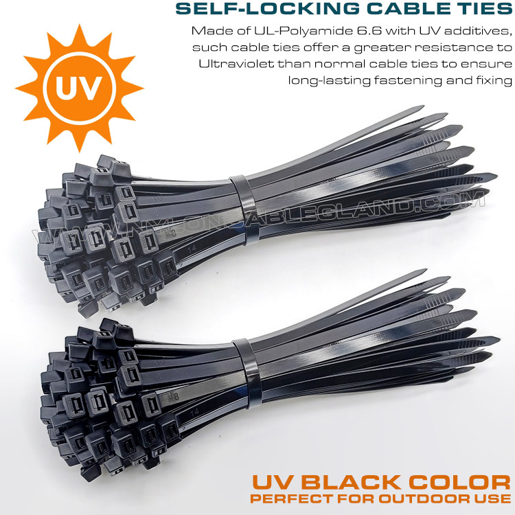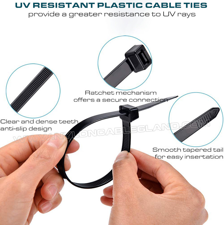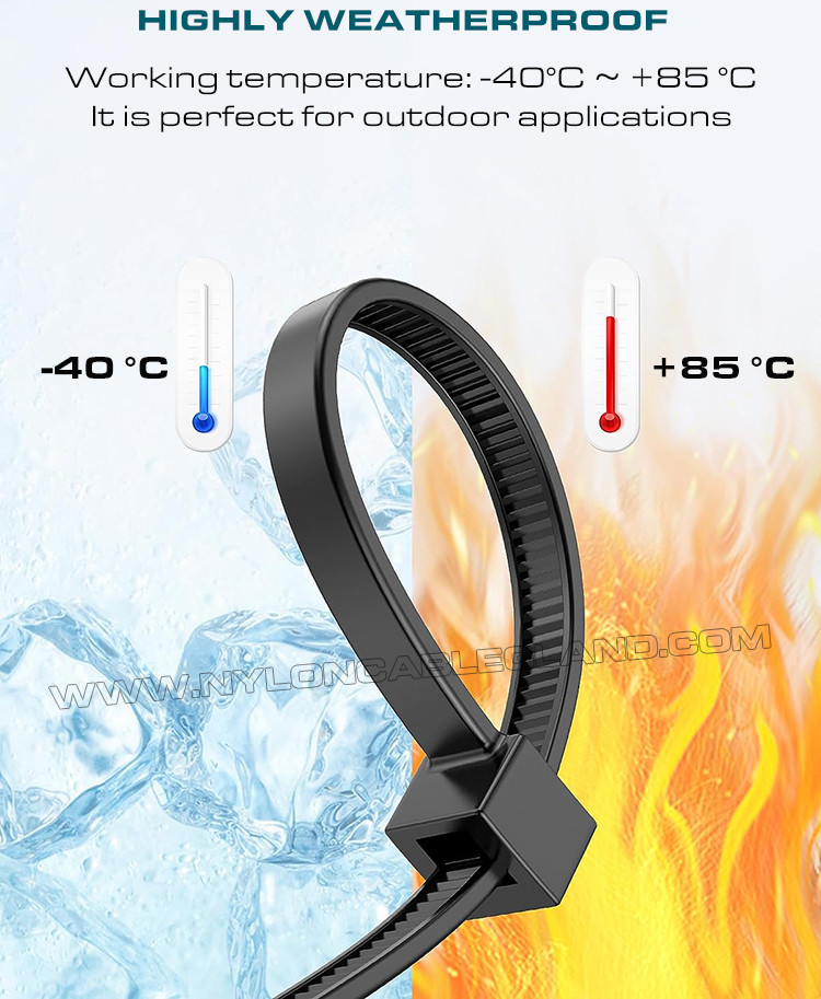 (2) Bảo vệ tia UV nâng cao: được chế tạo từ polyamide đen cao cấp 6.6 (UL 94V-2) với chất phụ gia UV, chúng có khả năng chống chịu thời tiết, cách điện và không dễ bị lão hóa, và có thể sử dụng trong môi trường từ -40℃ đến 85℃ (40°F - 185°F).