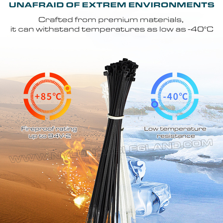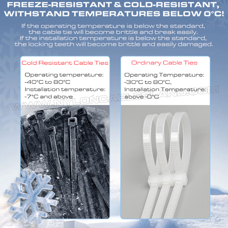 Dây buộc cáp chịu nhiệt độ thấp (còn được gọi là dây thít cáp chống đóng băng hoặc dây rút cáp chống sương giá) là dây buộc cáp nylon được thiết kế cho môi trường lạnh. Chúng được làm từ vật liệu nylon đặc biệt chịu nhiệt độ thấp (chẳng hạn như vật liệu PA6.6 cải tiến). Ưu điểm của chúng bao gồm khả năng chống sốc lạnh tuyệt vời (chống gãy giòn), độ bền cao, khả năng chống mài mòn cao, độ ổn định kích thước tốt, khả năng kháng hóa chất và tính chất điện tuyệt vời. Chúng có thể duy trì độ bền, độ dẻo dai và khả năng chống giòn ở nhiệt độ cực thấp (chẳng hạn như -40°C) thấp hơn so với nylon tiêu chuẩn. Chúng được sử dụng đặc biệt để cố định thiết bị ở những vùng lạnh hoặc trong các lĩnh vực công nghiệp yêu cầu vật liệu chịu được nhiệt độ thấp để đảm bảo các vật dụng được cố định chắc chắn và an toàn.